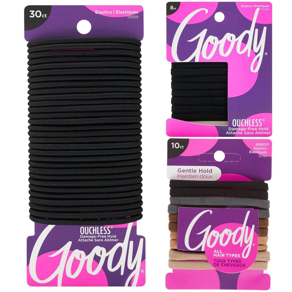 Keep your hair stylishly secure with the Goody Ultimate Daily Elastics Kit, a versatile collection of 48 ouchless hair ties and ponytail holders designed for all hair types. This kit includes 30 black ouchless elastics, 10 neutral seamless elastics, and 8 black seamless elastics – perfect for creating flawless ponytails, buns, braids, and everyday hairstyles without pulling or snagging.